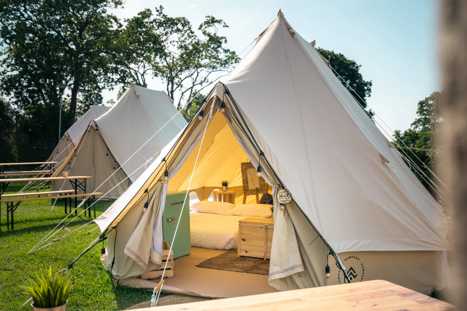 La reserva de nuestras tiendas Kampoh incluye todo lo necesario para que disfrutes desde el primer minuto: camas con ropa de cama, conexión eléctrica, iluminación interior y exterior, menaje completo (cubiertos, platos y vasos), mesa, sillas, nevera de playa y mucho más.